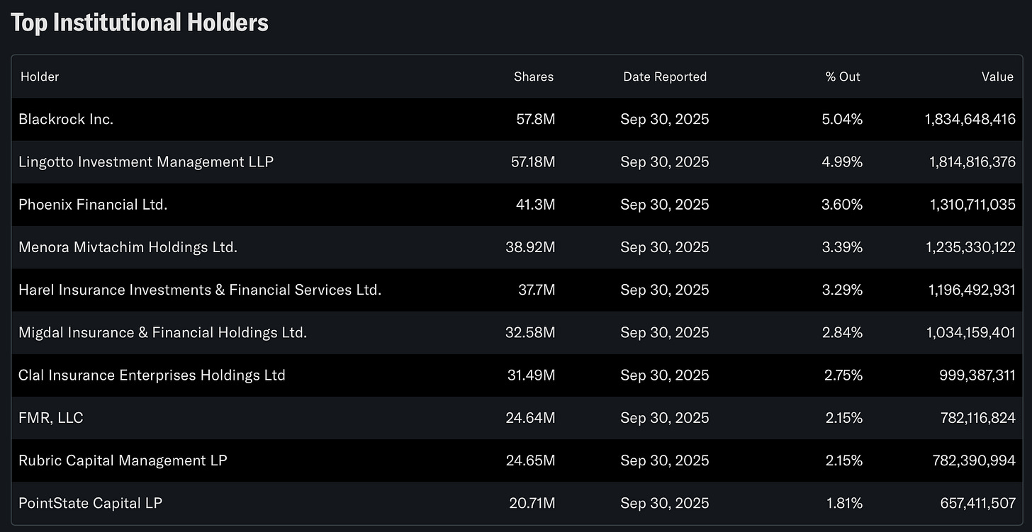 Phoenix, Menora, Harel, Migdal, and Clal arę all Israeli institutional giants. They hold Teva shares both for their own accounts (investing insurance premiums) and on behalf of members in their pension and provident funds. They are domestic anchor investors who are required to hold significant exposure to the local index (TA-35), of which Teva is a major constituent. Blackrock and FMR (Fidelity) are massive asset managers. Lingotto is the most interesting on the list; it is an investment management company owned by Exor N.V. (the holding company of the Agnelli family, which controls Ferrari, Stellantis, etc.). This is effectively a massive Family Office. Rubric Capital Management is a US-based hedge fund who is often value/contrarian focused. PointState Capital is macro/equity hedge fund.