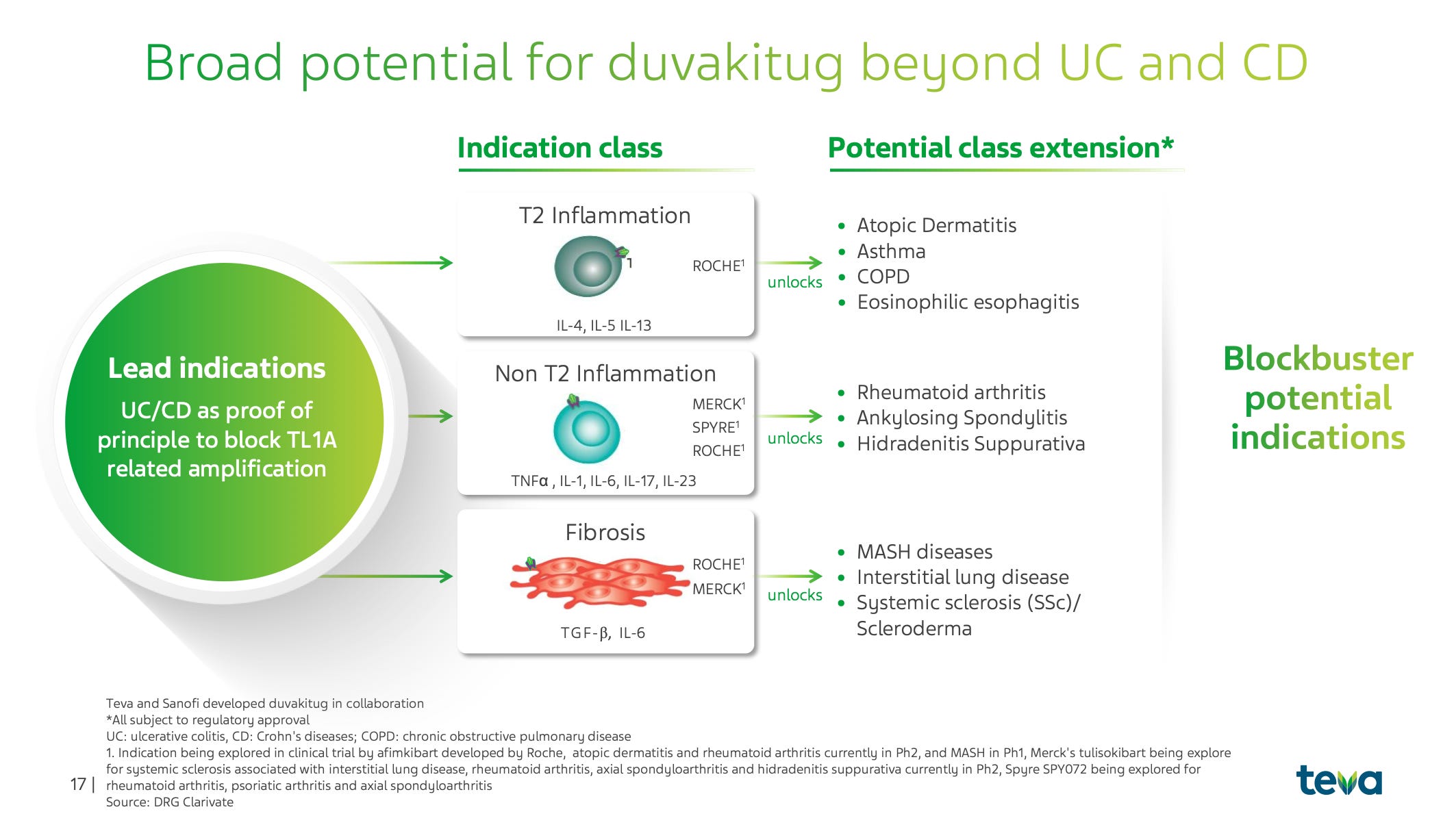 Pipeline breadth: Duvakitug is being positioned as a “pipeline in a molecule”. Beyond IBD, TL1A signaling is implicated in Atopic Dermatitis, Asthma, and Fibrosis. Teva plans to disclose additional indications in the second half of 2026, which could significantly expand the TAM. This feels similar to another very popular drug class.