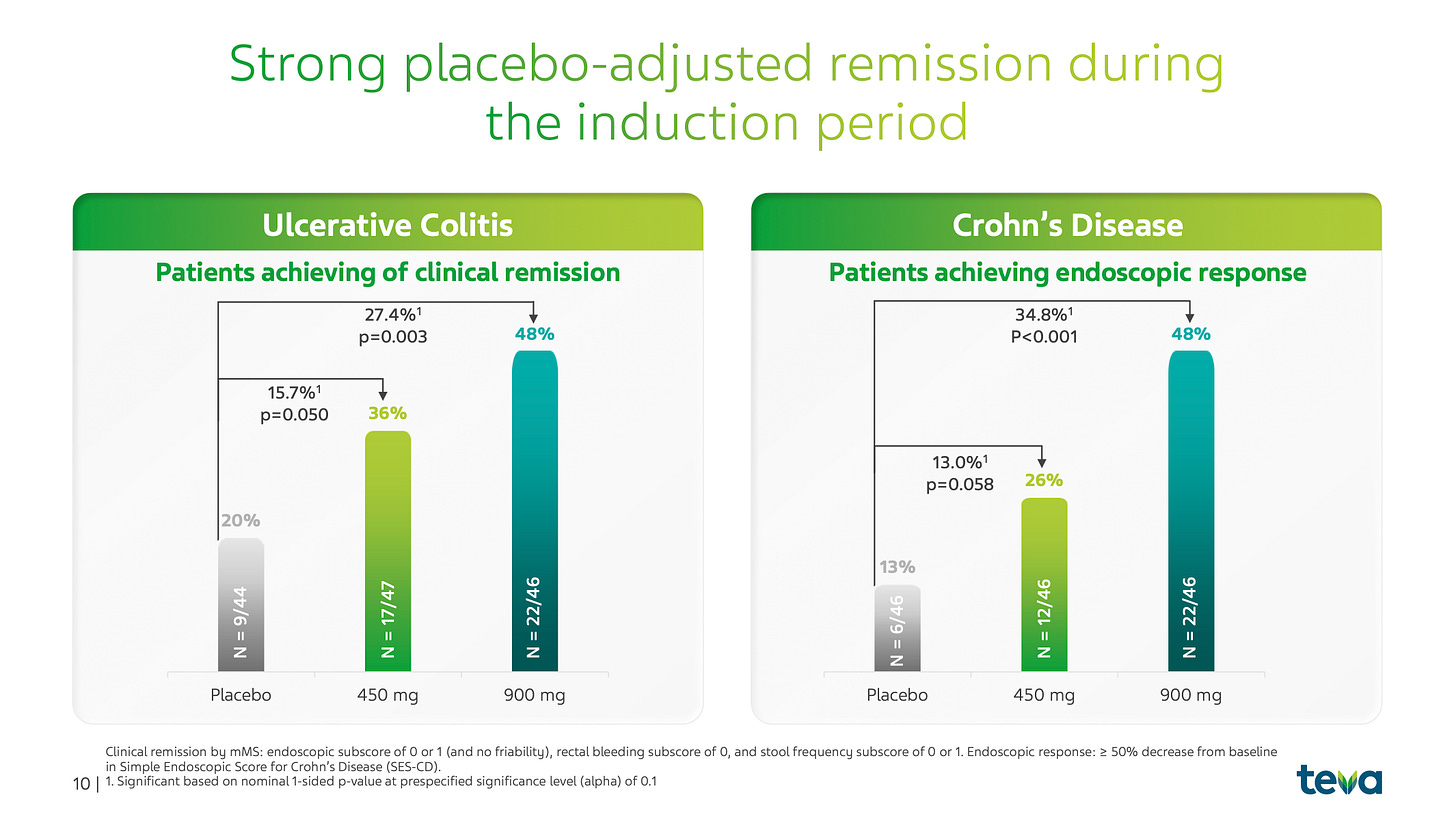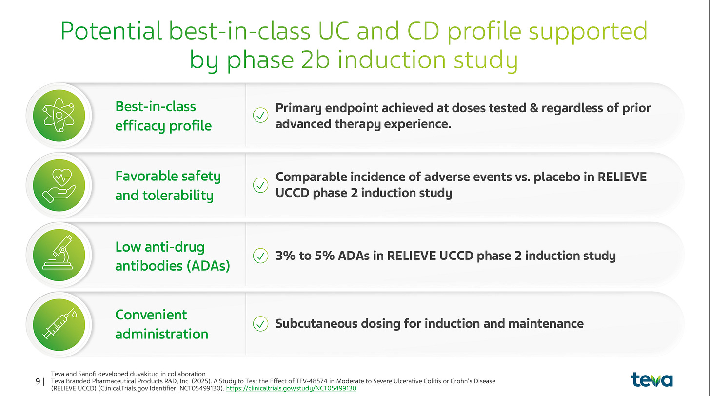 Risk sharing: The 50/50 profit and R&D cost-sharing agreement with Sanofi meaningfully de-risks the capital-intensive Phase 3 program. Teva received $250M milestones for both CD and UC Phase 3 initiations in Q4 2025 alone.