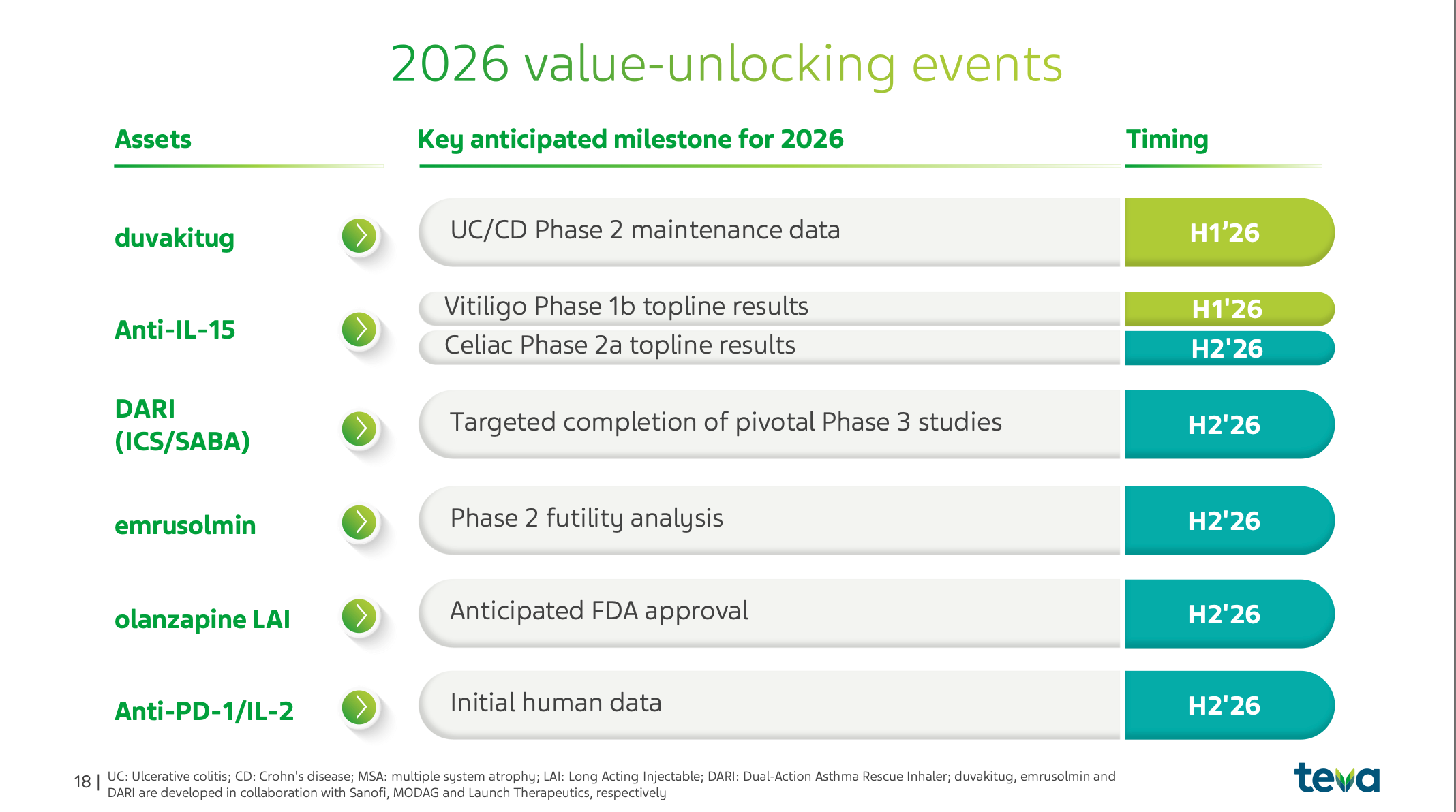 The scientific rationale, blocking DR3 while retaining DcR3, appears to be translating into superior clinical outcomes. With Phase 3 studies already underway and a plethora of other catalysts coming in 2026 (including olanzapine LAI approval and data for Anti-IL-15 in Vitiligo), the narrative for Teva has officially shifted from “stabilization” to “acceleration”.
